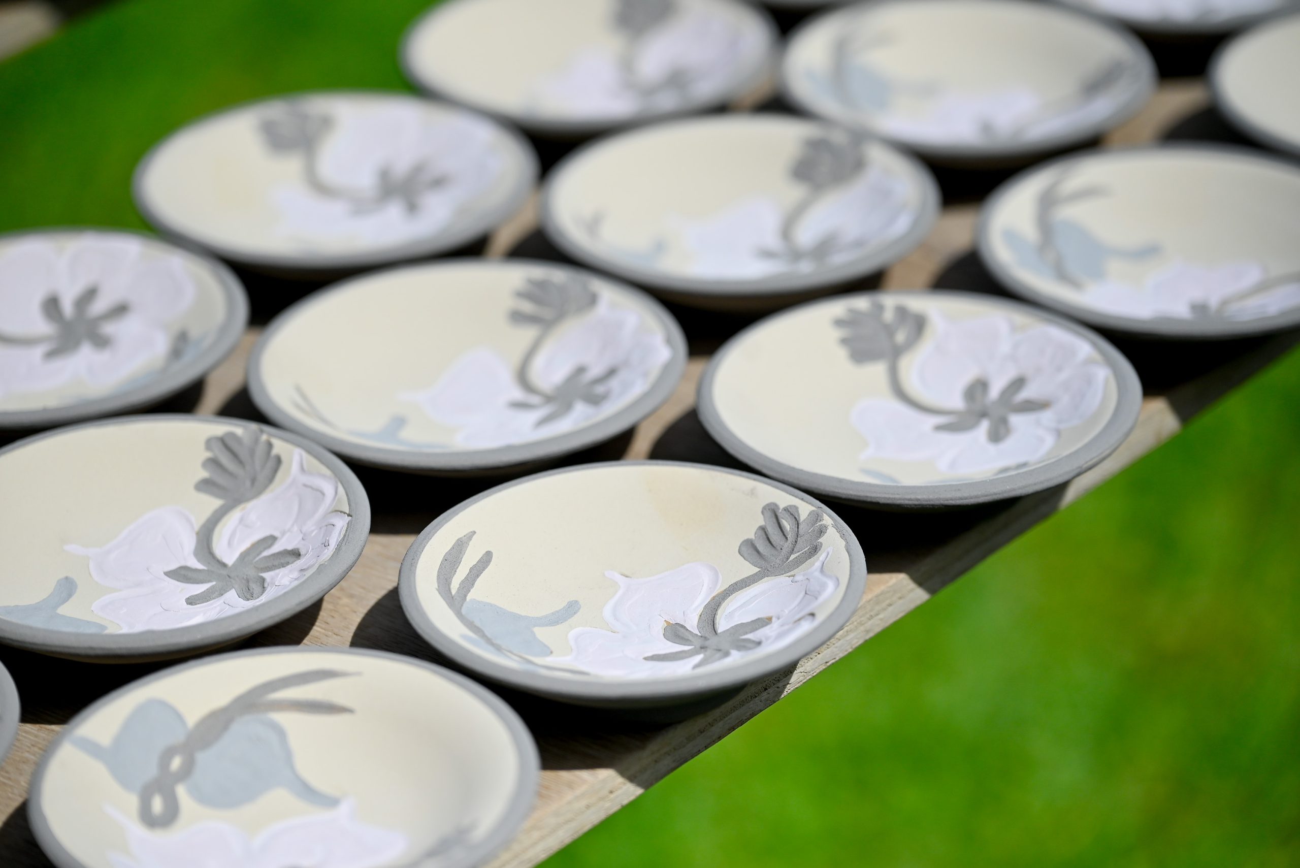 てぃーだの職人の作品もご購入いただけます。特徴的な絵柄は南国らしいハイビスカス模様。それを、線彫りや掻き落としの技法で表現しています。